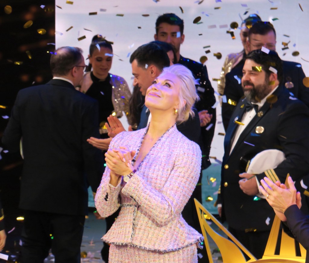 As TV screens showed a Nebuchadnezzar bottle of Veuve Clicquot champagne smashing against the hull of the 4,300-passenger ship, glitter fell from the ceiling and Hannah took a moment away from other dignitaries to clasp her hands and look upwards, savouring the moment.
