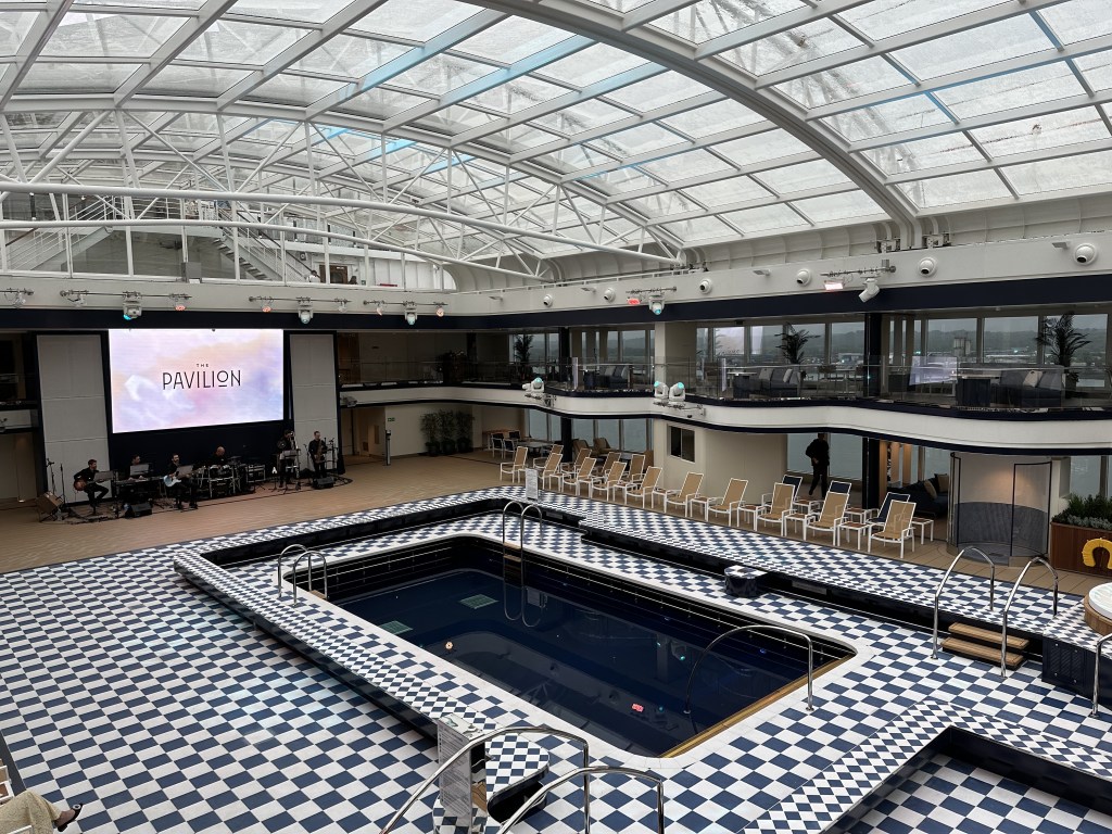 A main attraction is the two-deck Pavilion at the top of the ship – a glass-covered pool and hot tub area with a wellness café above.